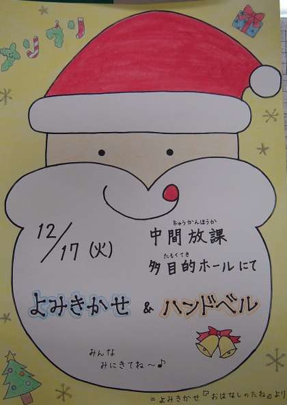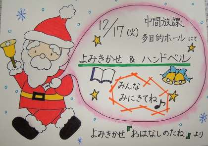 12月17日(火)に読み聞かせボランティア「おはなしのたね」さんによる「読み聞かせ&ハンドベル」を行います。写真は、おはなしのたねさんの手作りポスターです。すばらしいポスターをつくっていただきました。ありがとうございました。