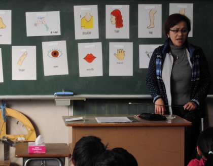 英語の時間に、体のいろいろな部分の名前を教えてもらいました。エリー先生が英語で言ったところをさわりました。歌に合わせて、さわるのもがんばりました。だんだん早くなる歌に合わせるのは大変!でも、おもしろい!