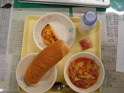 今日のメニューは、バターロール、牛乳、ミネストローネ、トマトオムレツ、いちごジャムでした。久しぶりのパン、おいしくいただきました。