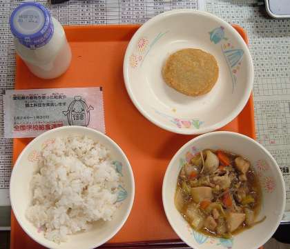 1月24日 本日の給食 公開日 2014/01/24 更新日 2014/01/24 本日の給食 今日のメニューは、麦ごはん、牛乳、ひきずり、えびのれんこんはさみ揚げ、味付海苔でした。ひきずりは味がしみ込んでいておいしかったです。