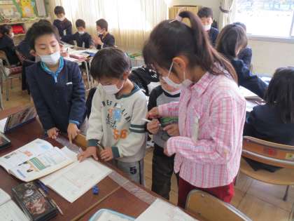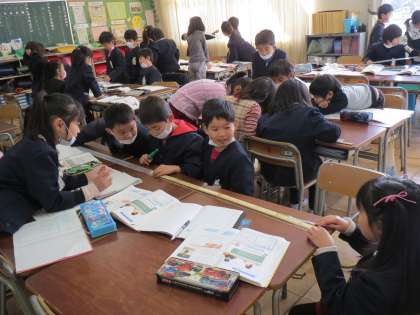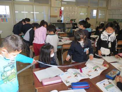 今日の算数の時間は、だれの感覚が1mに一番近いかを、みんなで計って調べました。子ども達の感覚は鋭く、3mmしか差がない子もいました。新しい単位「メートル」の量感を高めることができました。