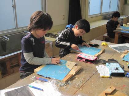 図工では、版画を制作しています。テーマは、動物、植物です。初めての彫刻刀でみんな四苦八苦。「手がいたーい」「どの刃を使えばいいのかな」といいながら、がんばっています。