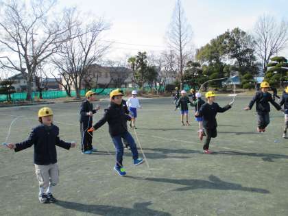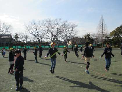 中間放課にリズム縄跳びに挑戦しています。「二重跳びが連続でできるようになった。」など練習に励んでいます。