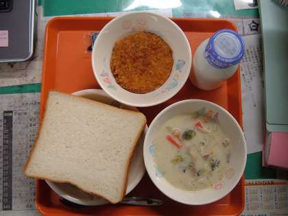 今日のメニューは、スライスパン、牛乳、具だくさん豆乳スープ、ハムカツサンドでした。久しぶりのスライスパン。ハムカツをはさんでいただきました。おいしかったです。