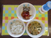 今日の献立は、ごはん、牛乳、いわしの梅煮、切干しだいこんのいため煮、ごまみそ汁でした。
