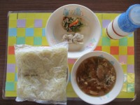 今日の献立は、 ごはん、牛乳、チンジャオロース、愛知の野菜春巻き、ビーフンスープでした。