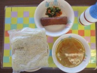 今日の献立は、ごはん、牛乳、さけと大豆の甘がらめ、いんげんのごま和え、わかめの...