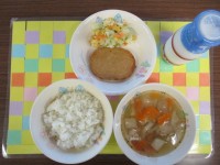 今日の献立は、ごはん、牛乳、ボロニアステーキ、春キャベツのサラダ、かぶのコンソメ...