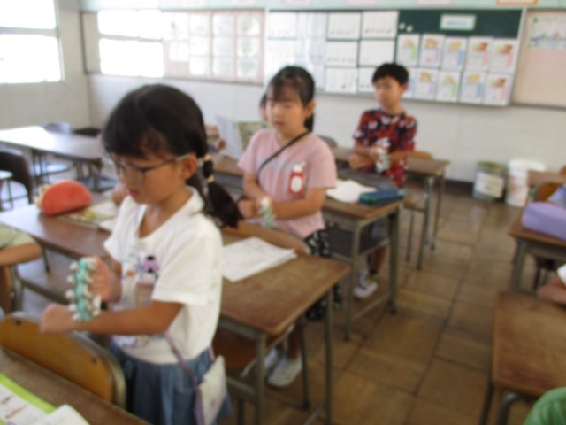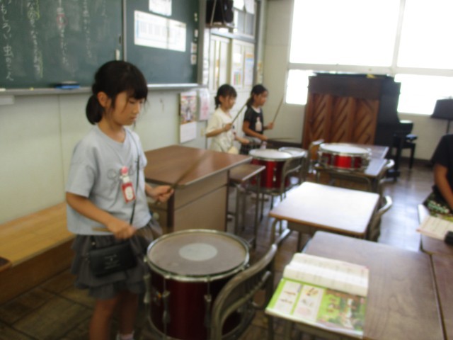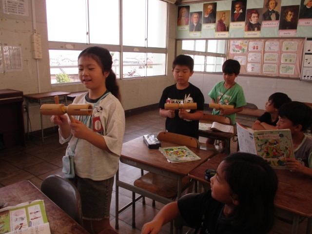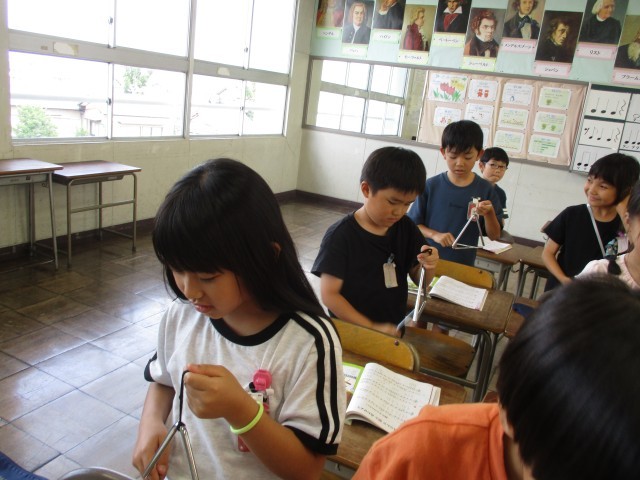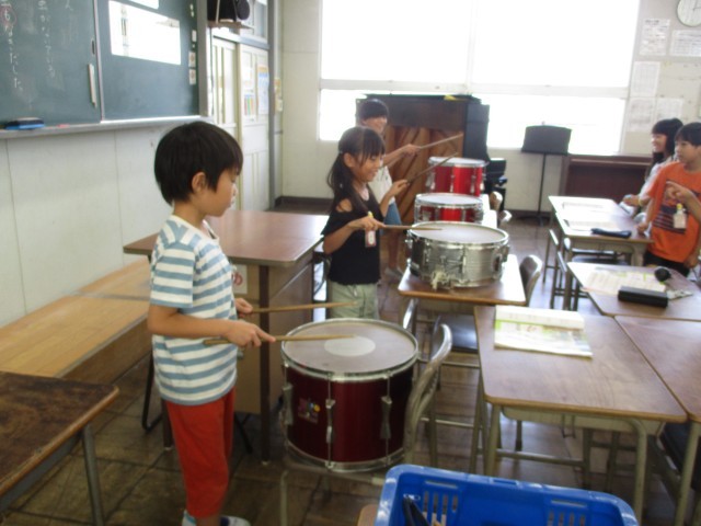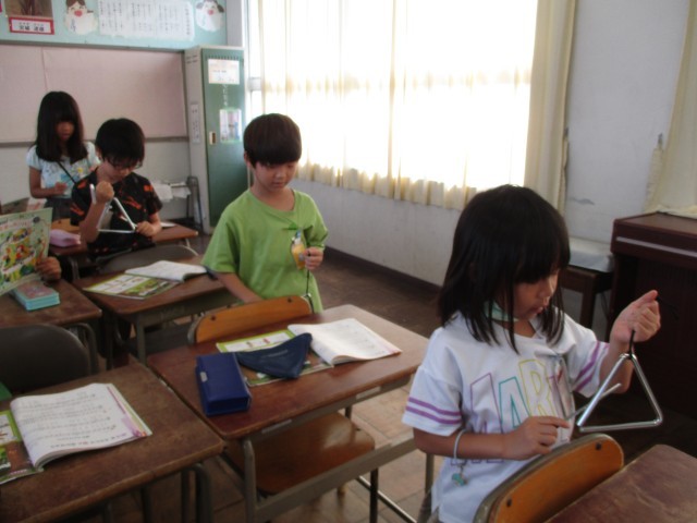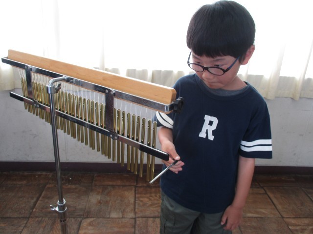 今日の音楽の授業は、「森のたんけんたい」という曲で楽器を使って演奏しました。ウッドブロックやトライアングル、小太鼓、ウィンドチャイムなどの楽器を使ってリズム打ちの部分を楽しく演奏しました。