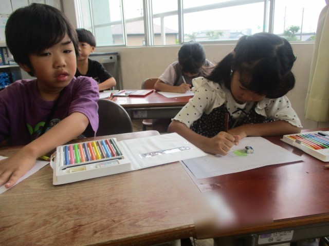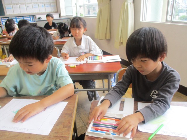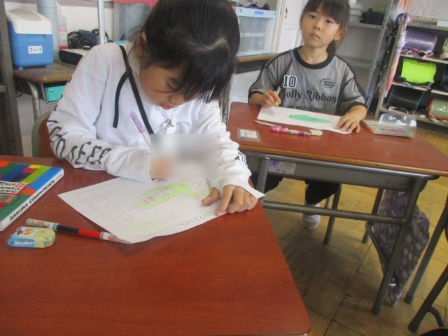 図工の授業の様子です。絵本の読み聞かせの後に、心に残ったところを絵に描きました。イメージを膨らませながら、心に残った場面を描いていました。