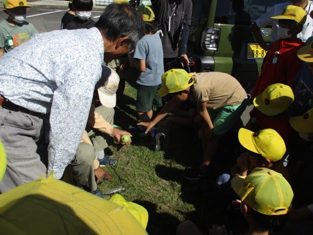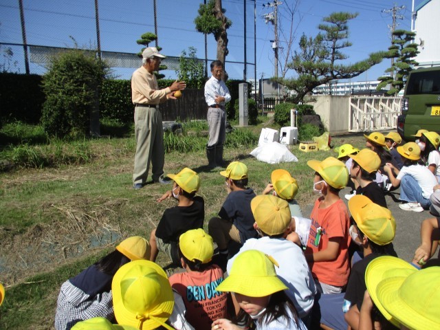 春から育てているひょうたんの収穫を行いました。ひょうたんの会の方々に教えてもらいながら、ひょうたんをペットボトルに入れて水につける作業も行いました。