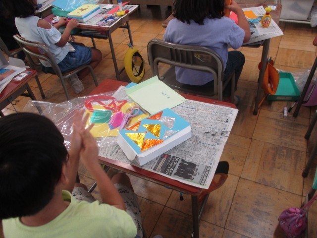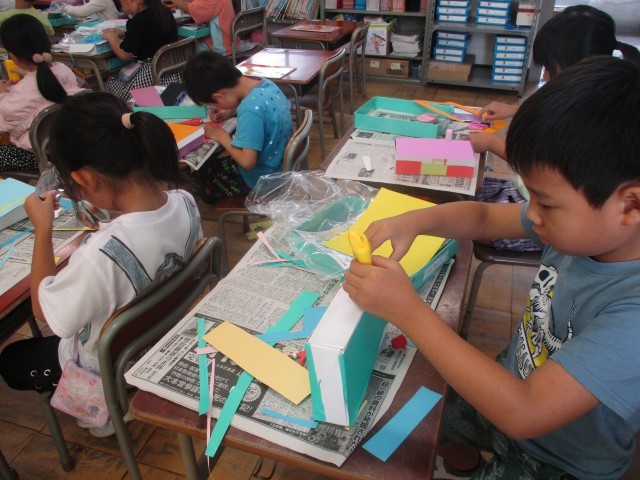 「たいせつボックス」で箱を作っています。展開図から箱に組み立て、様々な模様で飾っています。出来上がってくると「何を入れようかな?」と楽しみにしている様子が伝わってきます。