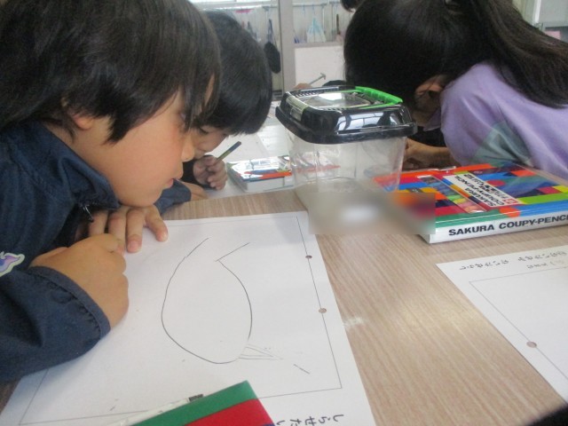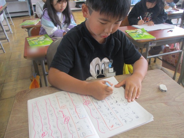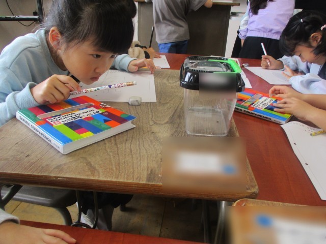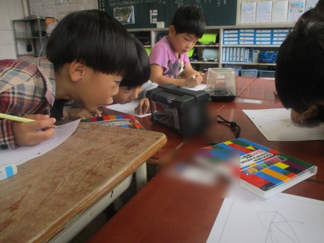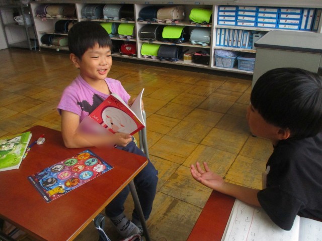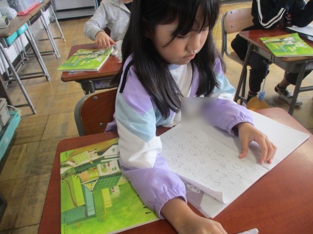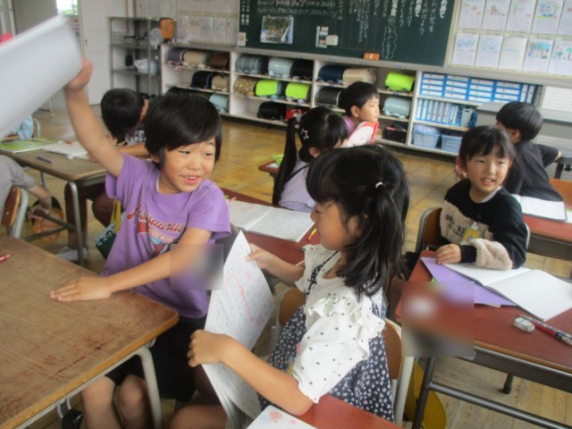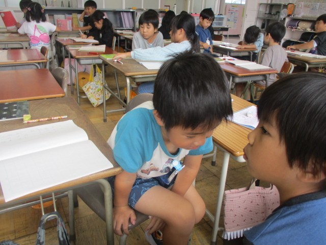 国語の授業の様子です。生活科の授業で捕まえたバッタやカマキリを観察しました。昨日と比べて、気付いたことが多く、じっくり覗いて観察することが出来ていました。「くじらぐも」の授業も終わりにさしかかり、まとめに入りました。じっくり考えて書いたり、ペアで話したり、みんなの意見を聞いたりしながら、一生懸命頑張っています。みんなで楽しく取り組んでいます。