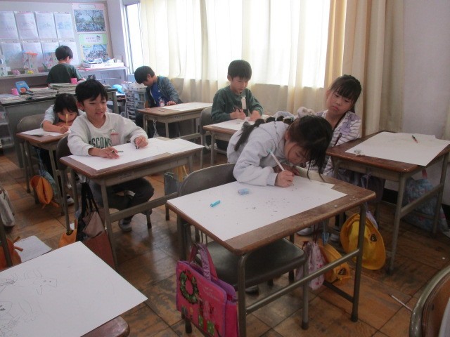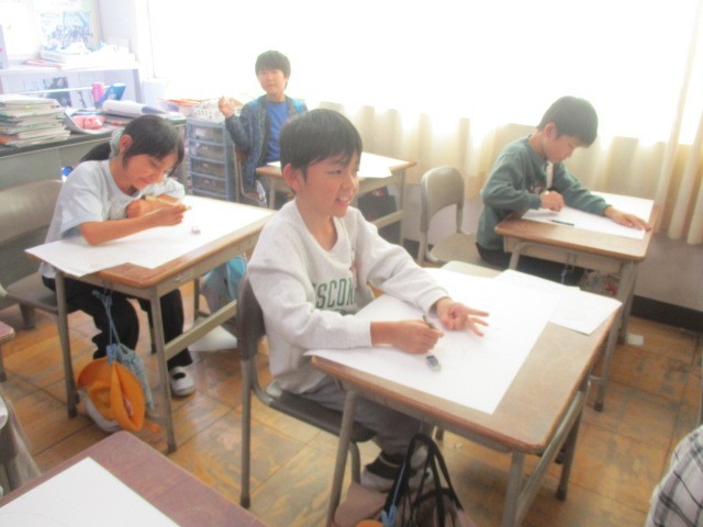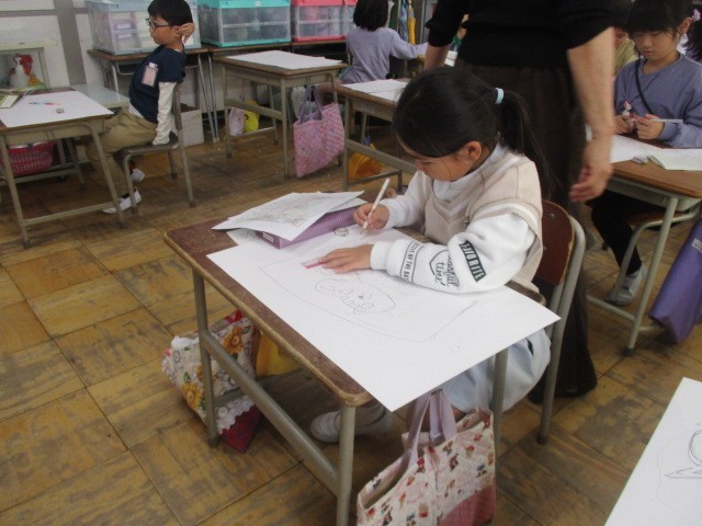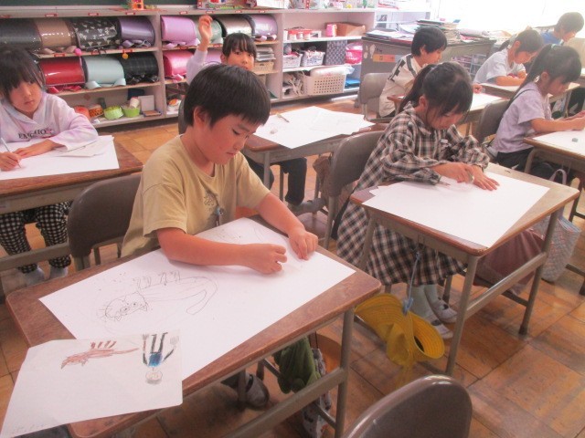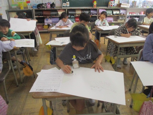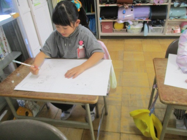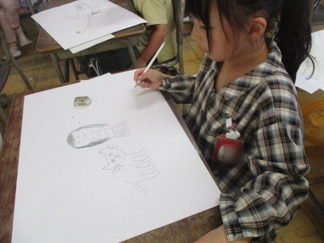 今日の図工の時間は、「お話から生まれたよ」の下書きを基に、四つ切画用紙に描きました。猫を大きく描くことを頑張っていました。