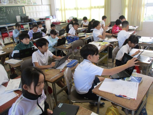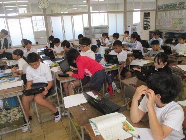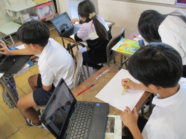 図工の学習では、国語で学習した「たずねびと」を題材にして、読書感想画にどんな絵を描きたいかを考えました。タブレットで過去の作品を見たり、「たずねびと」について深く調べたりしながら、自分の描きたい作品について考えることができました。