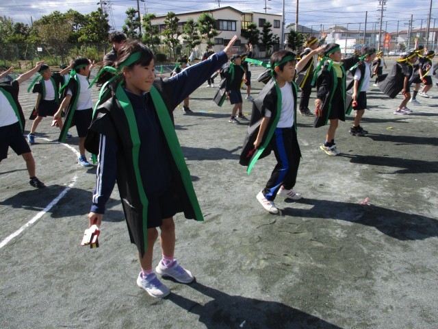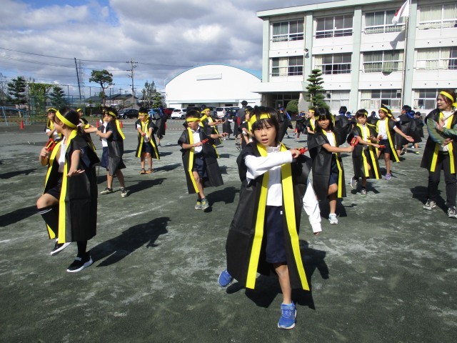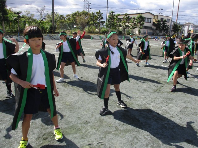 運動会の衣装を着て本番と同じように踊って練習しました。なるこを持って一生懸命踊る姿がかわいらしかったです。