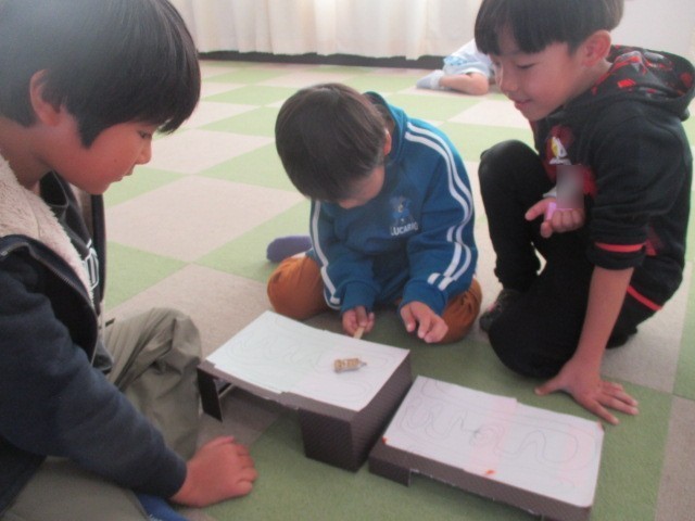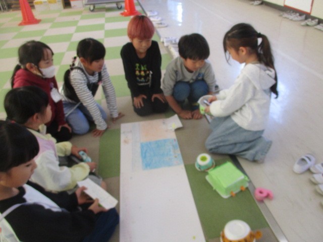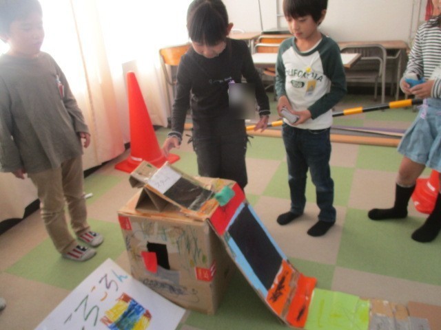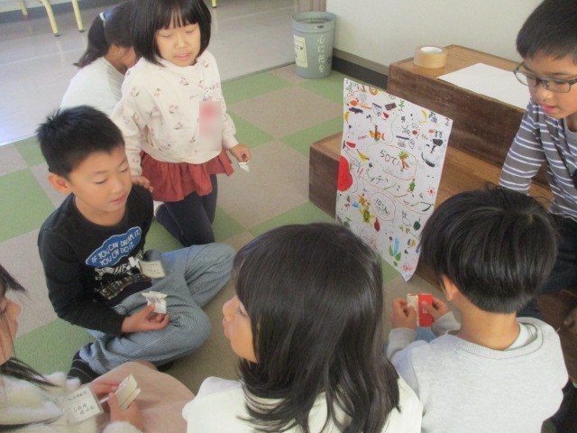 今日の生活の時間は、1年生を招待して自分たちが作ったおもちゃで一緒に遊びました。遊び方やルールを説明したり、獲得点数を言ってあげたりしながら、笑顔いっぱい楽しく遊びました。
