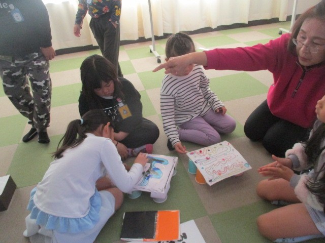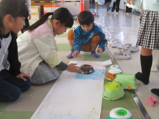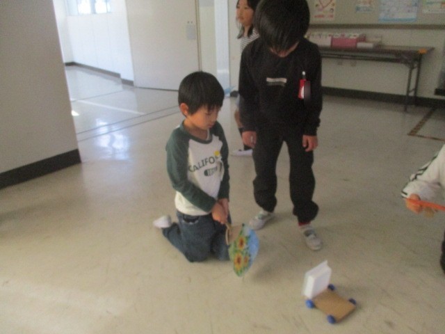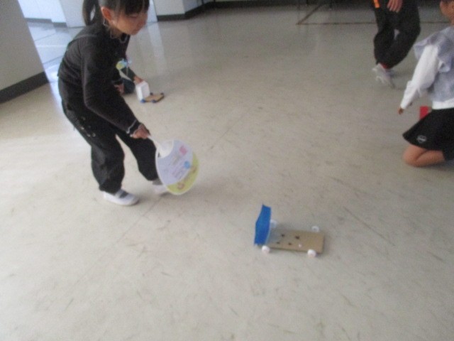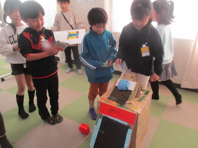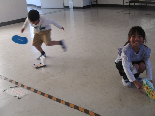 今日の生活の時間は、1年生を招待して自分たちが作ったおもちゃで一緒に遊びました。遊び方やルールを説明したり、獲得点数を言ってあげたりしながら、笑顔いっぱい楽しく遊びました。