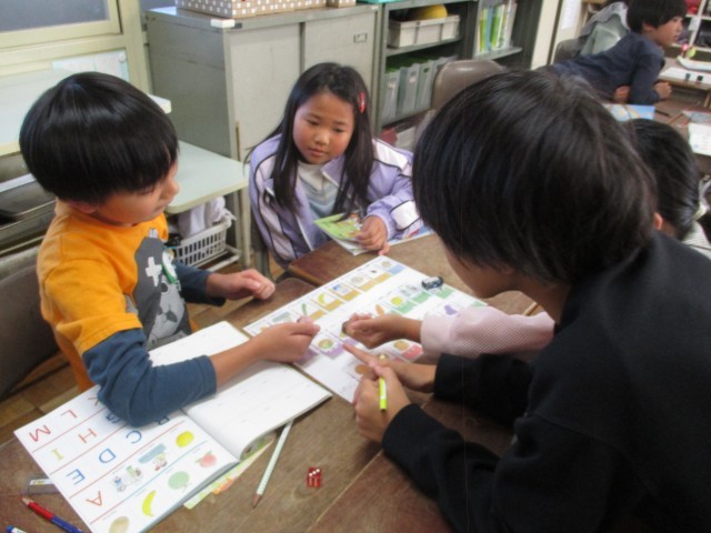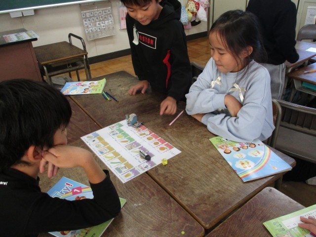 ALTの先生と英語活動に取り組みました。好きな食べ物や遊びを尋ねる学習を進めながら、すごろくゲームを通してさらに理解を深めることができました。