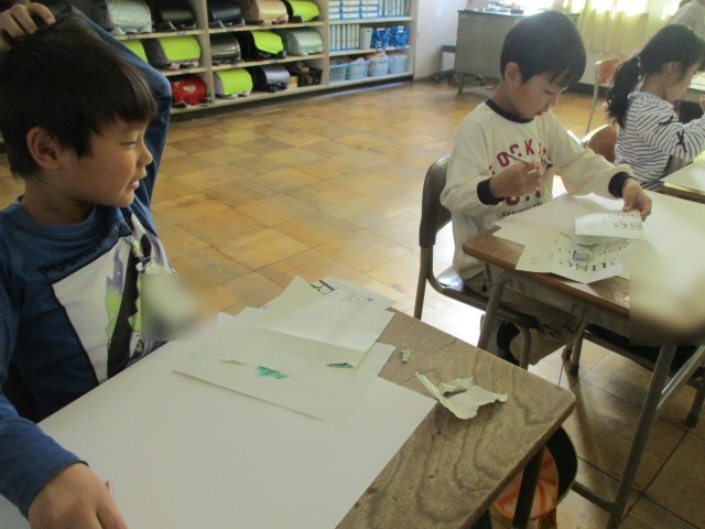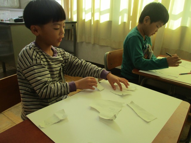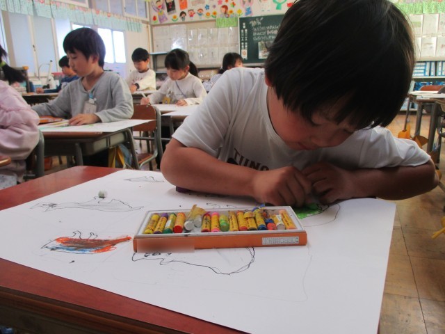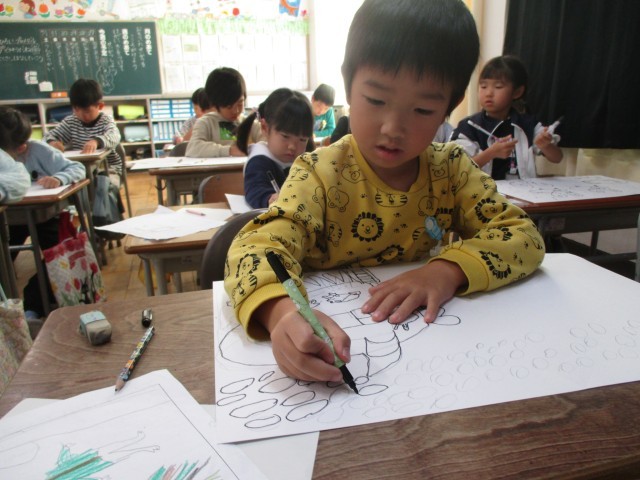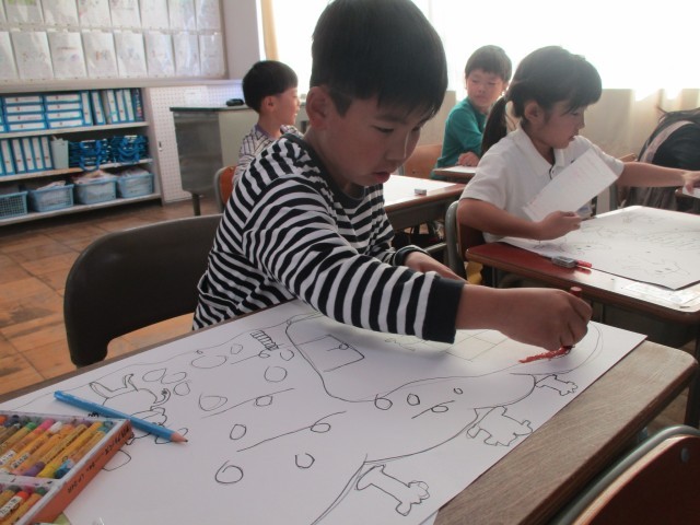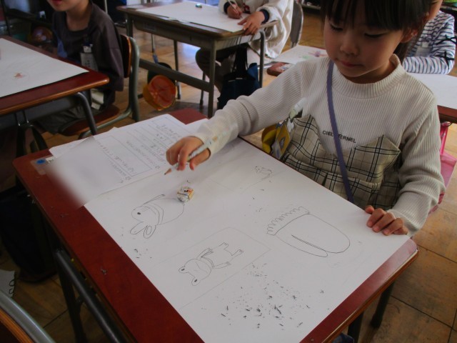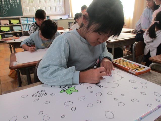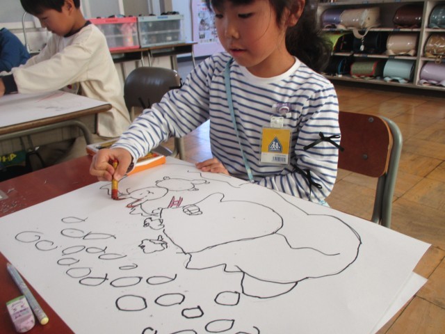 読書感想画の授業が始まりました。「てぶくろ」のお話を読んで、思い浮かべたことを絵にあらわしています。今日は、それぞれの動物たちの配置を決めたり、動物の輪郭を描いたりしていました。「こんなのもいいよね」「もっと大きく描いたほうがいいかな」と、一生懸命描いていました。