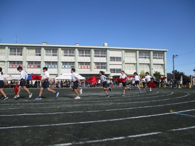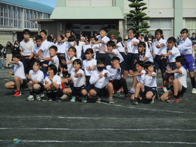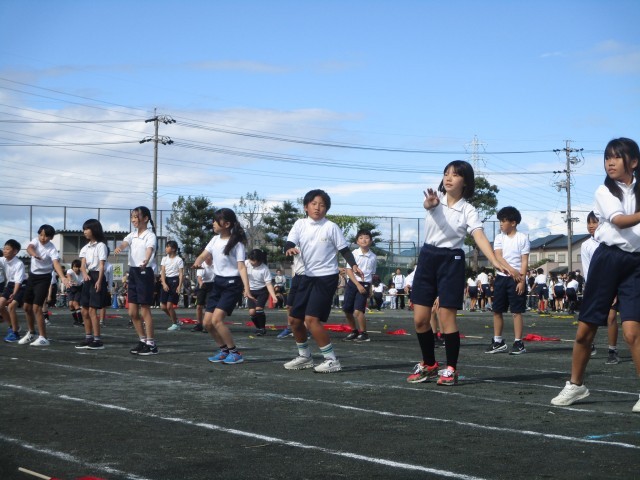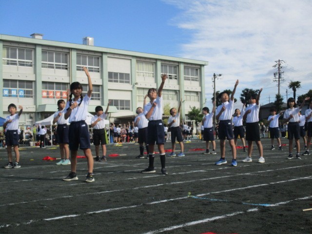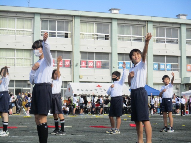高学年の表現運動である『心をひとつに』では、日々の練習の成果を発揮して、元気よく踊ることができました。行進の動きやフラッグの上げるタイミングなど、練習の中でどんどん合わせられるようになっていき、今日につなげることができました。
