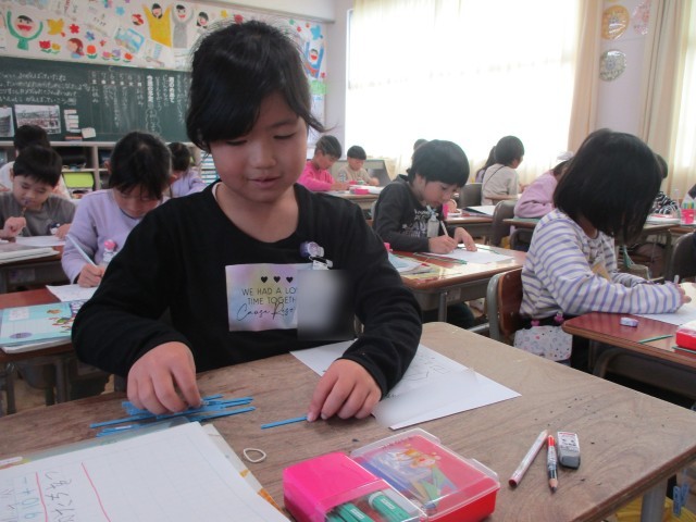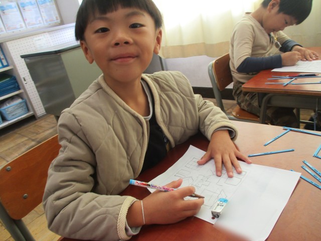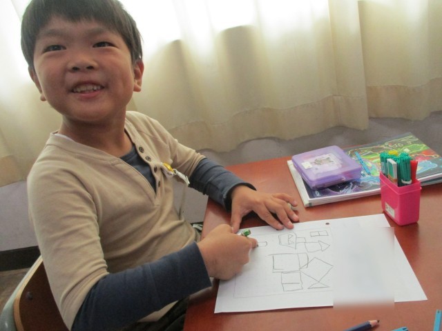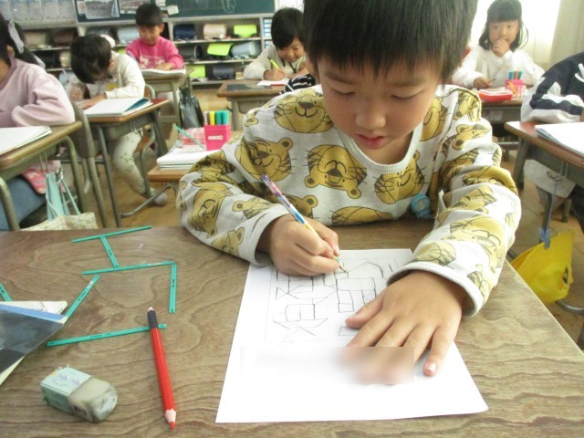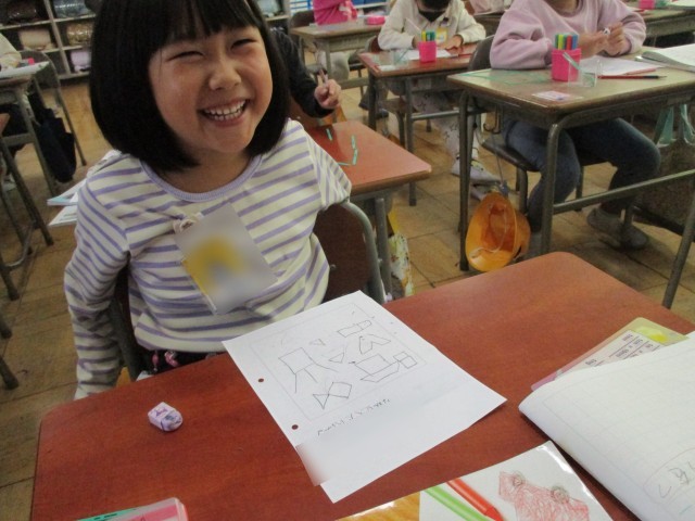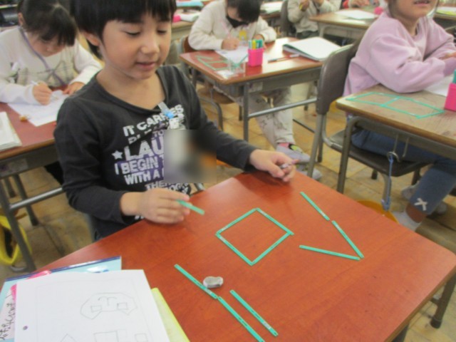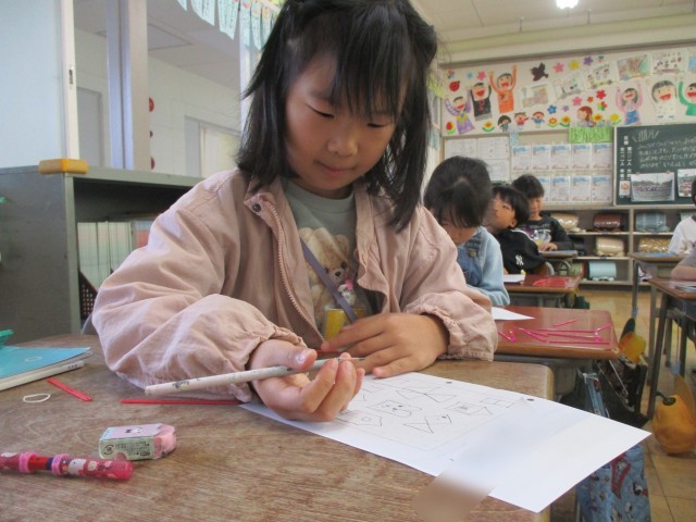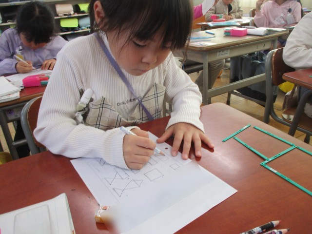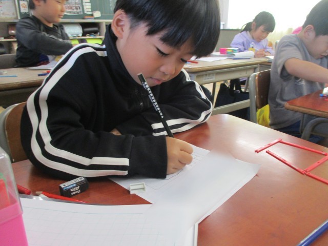 算数の授業で、点つなぎをしました。前回やった棒で形を作ってから、点と点をつないで形を作っていきました。「やったことある!」と言ってどんどん形をかいている子がいたり、「漢字も作れた!」と、新しい発見をしている子もいたりしました。丁寧に点をつなぐことができていました。