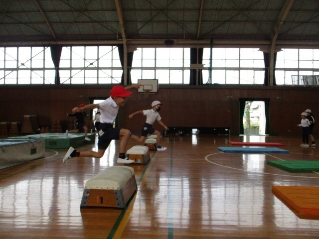 2年生の体育では「リレーあそび」の学習を行っています。この日は障害物リレーを行いました。どうしたら速くリレーができるかを話し合い、走る順番や障害物の通り方を工夫していました。