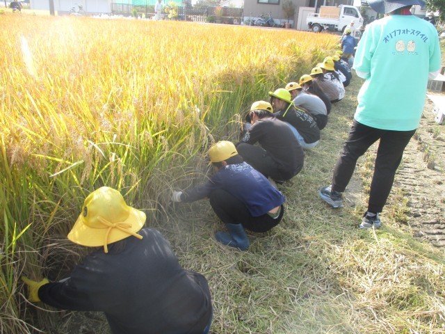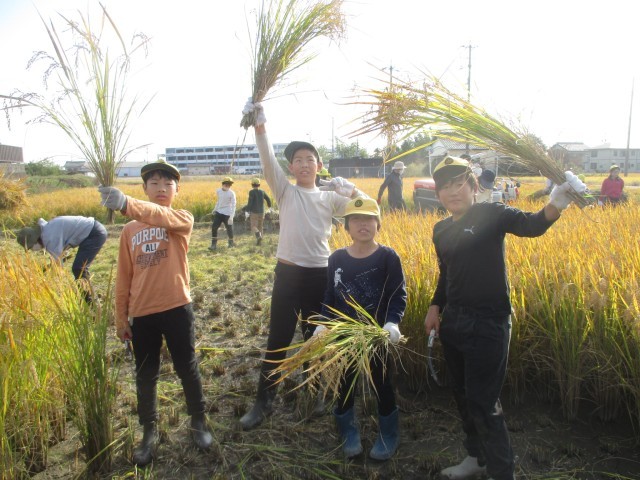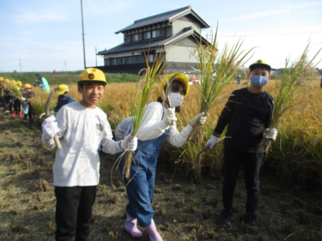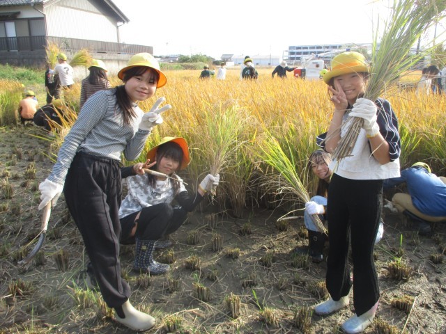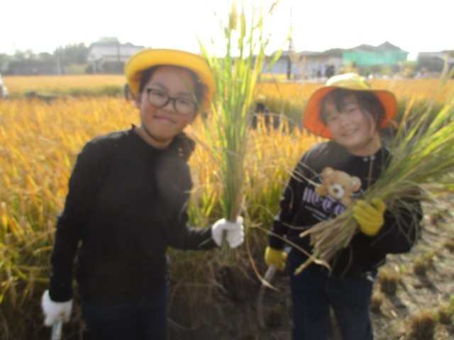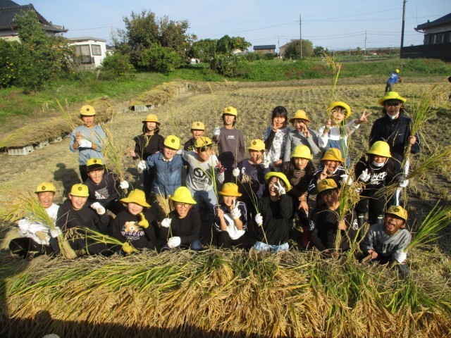 地域の方に育てていただいた田んぼの稲の稲刈りを行いました。みんなで協力して行ったことで、短い時間で全ての稲を刈ることができました。時間もあったので、地面に落ちた穂も最後までしっかりと拾い、大切に大切に穂を集めることができました。