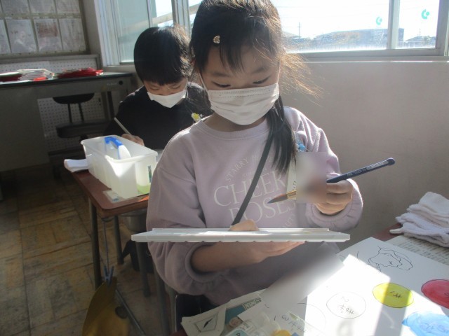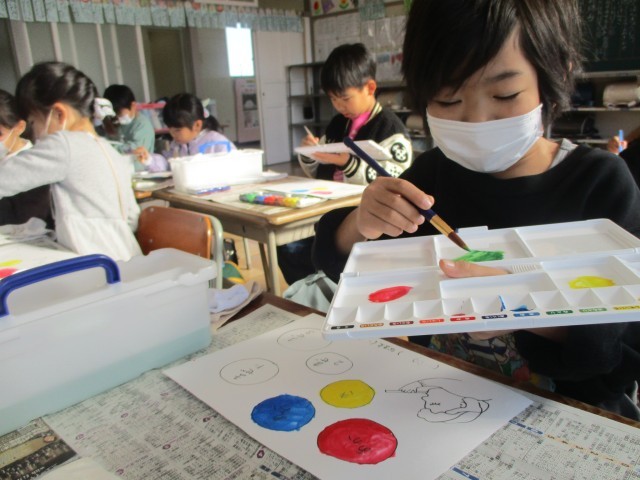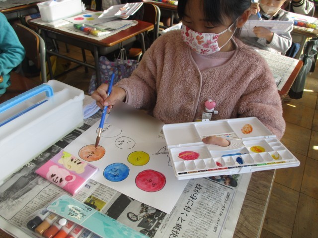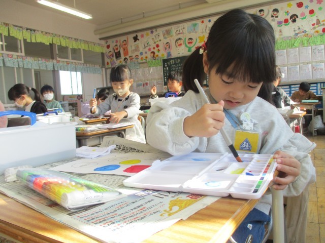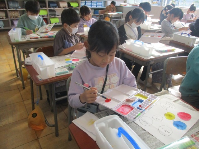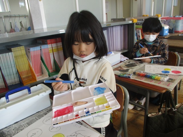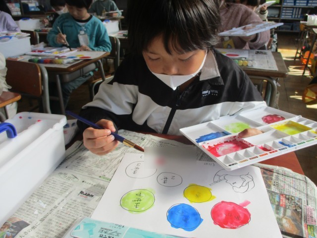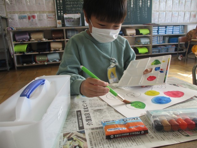 本日、図工の授業で絵の具を使いました。パレットに絵の具を出して、混ぜながら、どんな色になるのかワクワクしていました。きれいな色になったり、意外な色になったりと、とても楽しく活動していました。