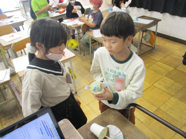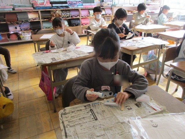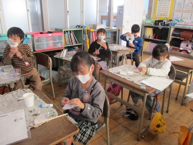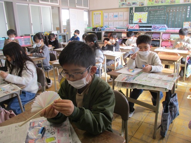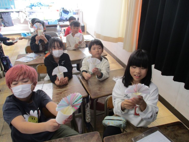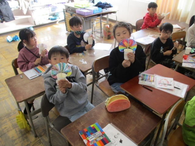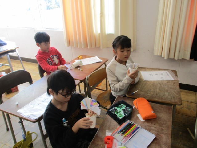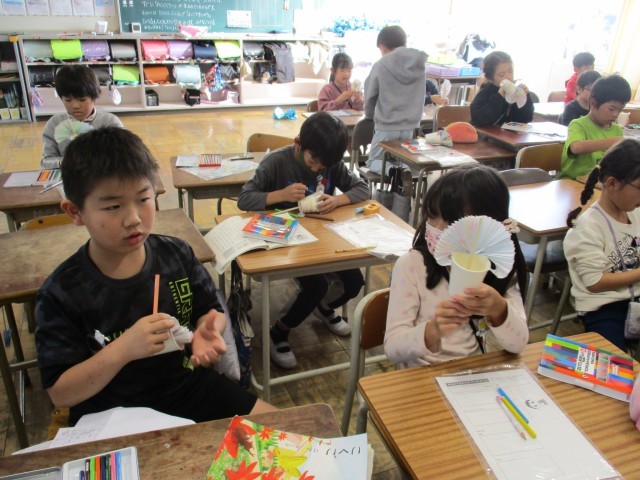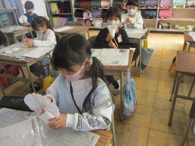 国語の授業で、「紙コップ花火の作り方」を勉強しています。今日は教科書の文章に添って、紙コップ花火を作ってみました。最後の部分が難しいと言いながら完成させていました。