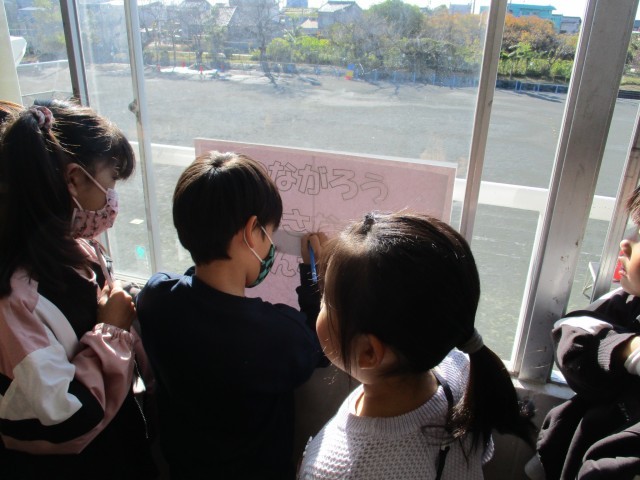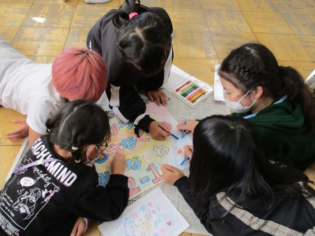 現在、人権週間ということで、各学級でいじめ防止のスローガンを考えました。クラスみんなで考えたスローガンを画用紙にかきました。一人一文字ずつ色をぬり、クラス全員でポスター作りをしました。