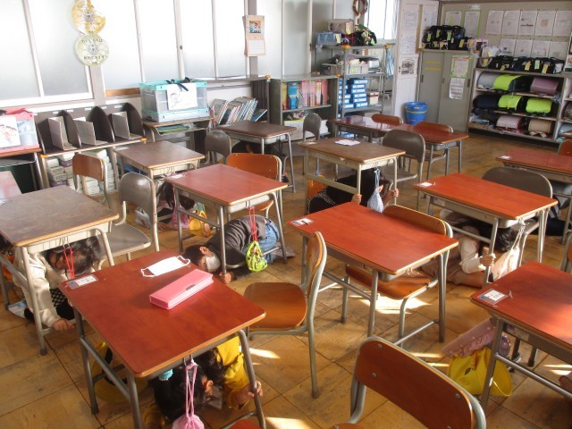 朝の会の途中で警報音が鳴りました。避難訓練です。今朝は地震に備えて訓練が行われました。児童の皆さんはすぐに机の下に入り頭を隠していました。「椅子の足をもって頭を保護するとよい。」と聞くとすぐに行っていました。いざという時のためにしっかり行動することができました。