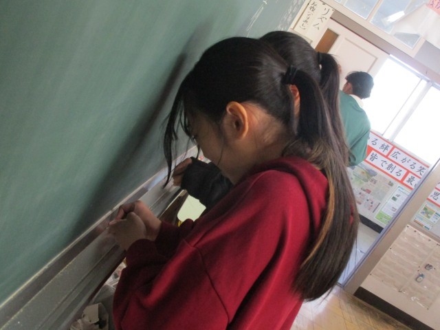 家庭科の学習で、教室の中にはどんな汚れがあるのかについて調べました。普段あまり意識して掃除していないところを探し当ててテープで取り、いろいろな汚れを見つけました。壁沿いや角にほこりがたまりやすいことなどに気づくことができました。