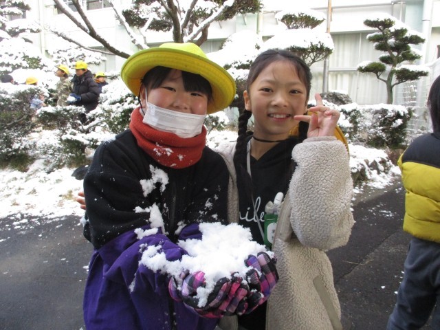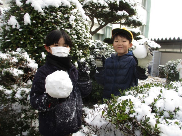 今朝雪が降ったので、みんなで雪遊びをしました。雪だるまを作ったり、雪合戦をしたりしました。短い時間でしたが、子どもたちは大喜びで雪に触れあっていました。