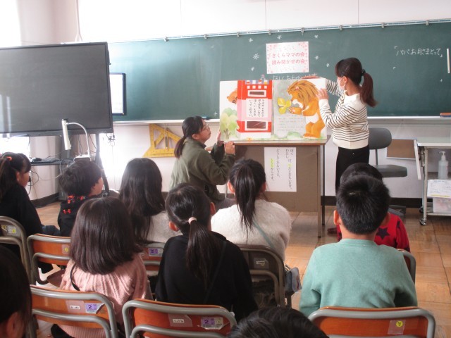 さくらママによる読み聞かせがありました。「今日の本は何かな?」と楽しみにしていました。「パパお月さま とって」「ぽんたのじどうはんばいき」を読んでいただきました。本には仕掛けがあり、聞いても見ても楽しめました。心がほっこりした時間でした。ありがとうございました。