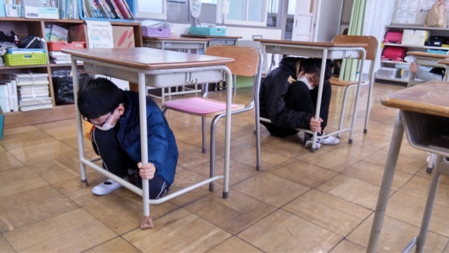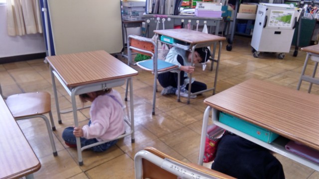 2月のシェイクアウトは、朝の会に地震が起きたことを想定して行いました。緊急地震速報のデモ音源が流れると、子どもたちは素早く机の下に入って、身を守ることができていました。