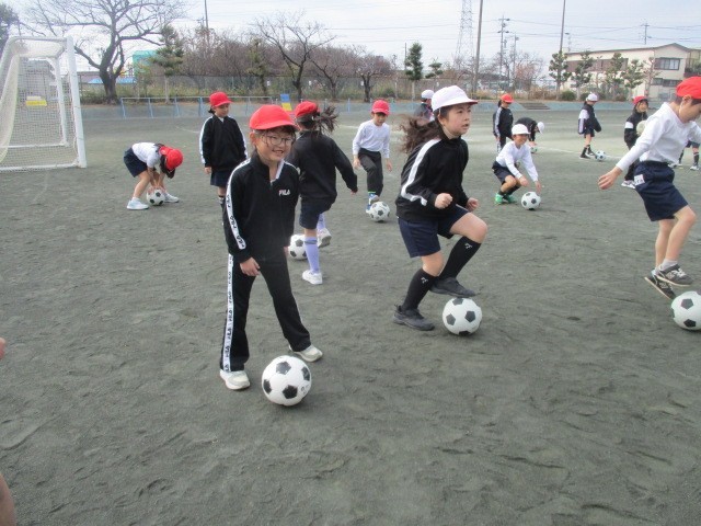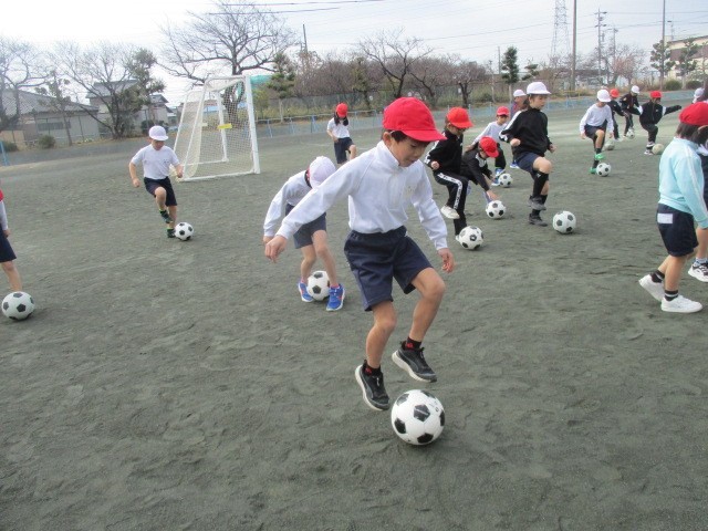 今日の体育の授業は、サッカーボールを使ってボール蹴り遊びを行いました。パスの練習をしたり、蹴り方を覚えたりして楽しく学習しました。