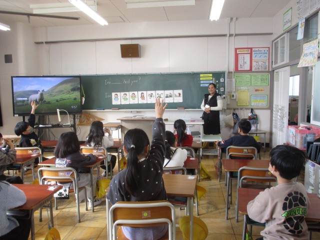 「サンデー!マンデー!・・・」教室に元気な声が響きます。今日は楽しみにしていた英語です。毎回楽しいゲームも取り入れてくださるので、遊びながら発音を学びます。今日は「ファイン・グッド・ハングリー・・・など」気持ちを表現しました。表情もつけている児童もいて、楽しそうでした。