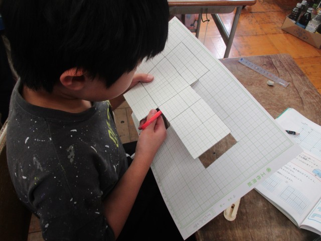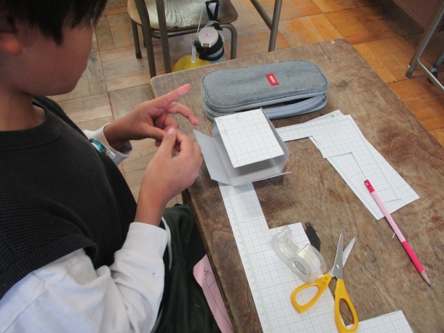 算数で「直方体と立方体」について学習しています。今日は立体を辺にそって切り開く「展開図」についてグループで検討してから、それぞれで書いてみました。書いた図形を切って実際に組み立ててみました。直方体ができあがると子どもたちは大喜びで、近くの友達と比べていました。