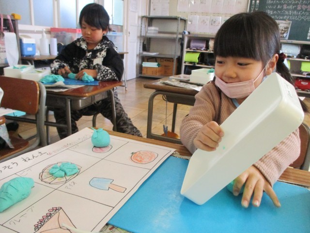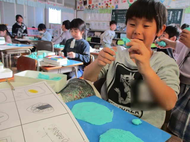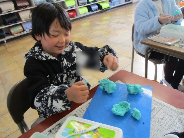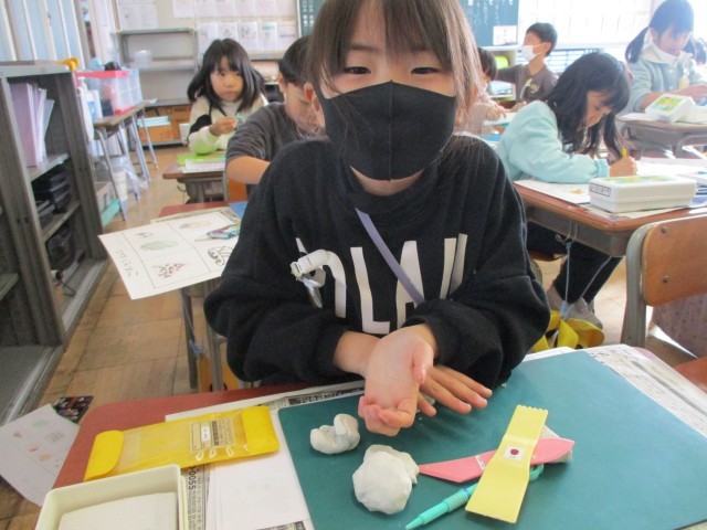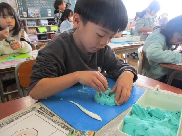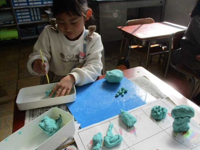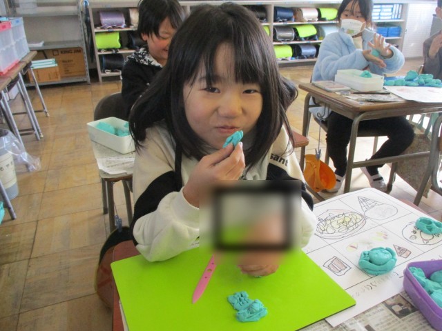 図工の授業の様子です。粘土でごちそうを作りました。納豆巻きやクロワッサンなど、美味しそうに見えるよう、工夫して作っていました。