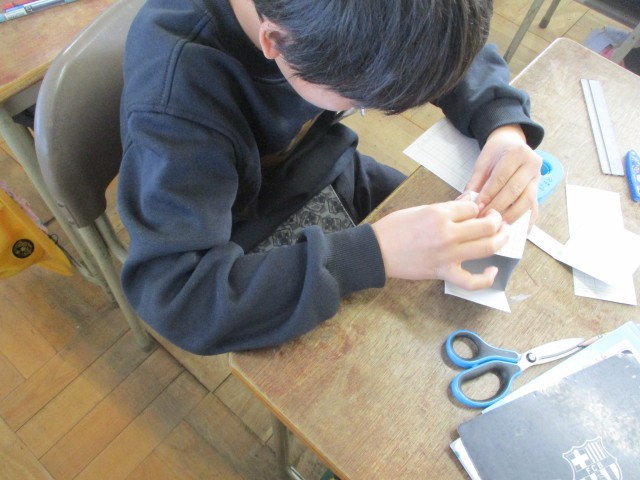 立方体の展開図をかいて、実際に立方体を作りました。展開図は1種類ではなく、いくつかあることに驚きながら、楽しく取り組んでいました。