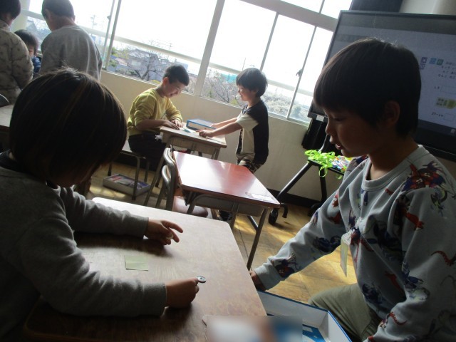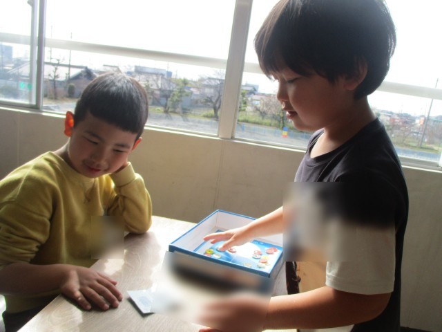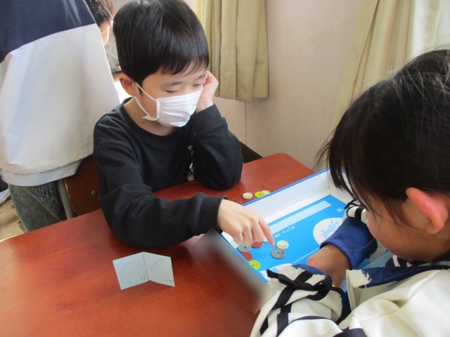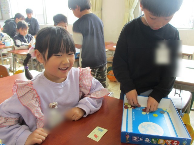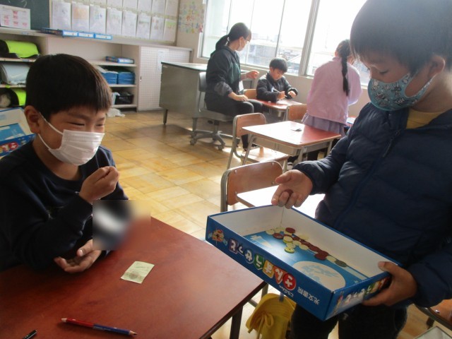 算数の授業の様子です。100までの数の計算で、二つの品物を買うゲームをしました。「頭の中で計算できる!」「26+3だから、29!」と、計算をして、お金を出していました。お店の子も確認して、「合っているよ!」と伝えていました。