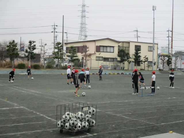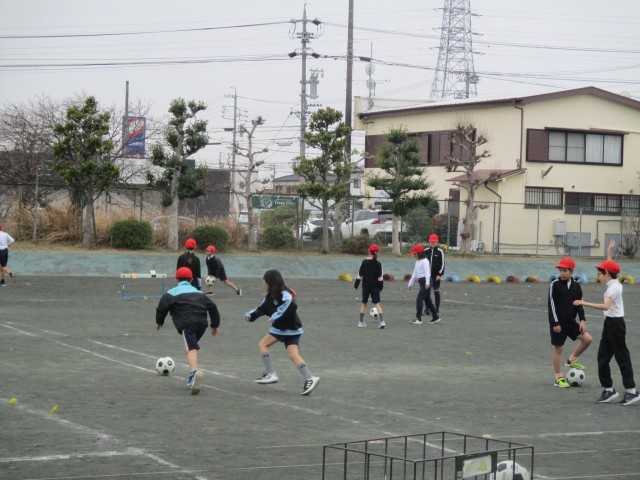 サッカーの学習の様子です。試合に向けてチームごとに練習しました。