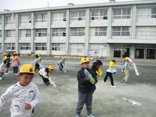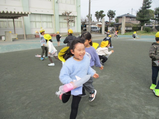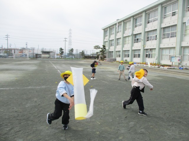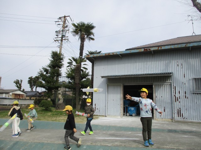 生活科の授業で、傘袋ロケットを作って、飛ばしました。重りやはねを付けて、風に上手く乗ると、遠くまで飛んでいきます。高くから飛ばしてみたり友達と競争をしたりして、夢中になって遊んでいました。