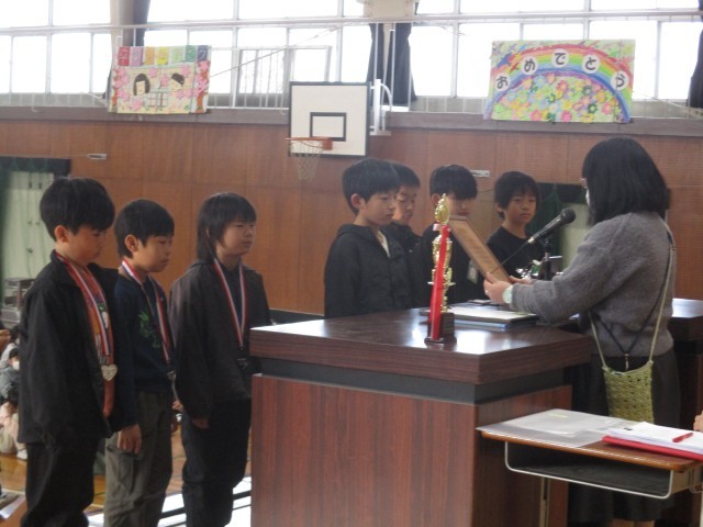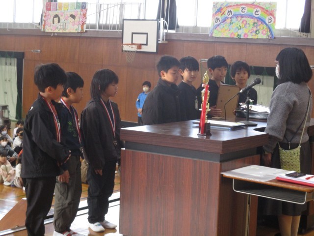 「サッカースクール」「ママキッズサッカー」の表彰伝達がありました。全校の前で表彰され、賞状、盾、メダルなどを受け取りました。