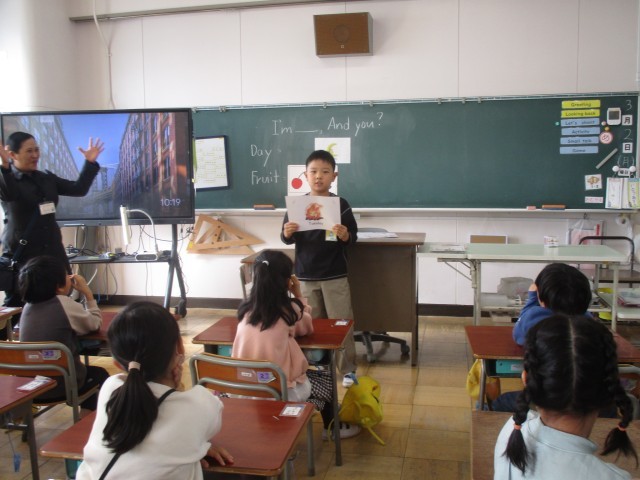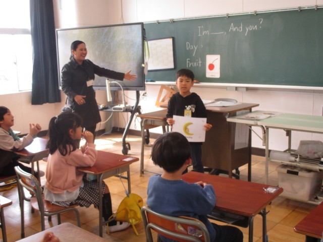 英語では、1年間のまとめを行いました。果物や曜日など学んだことを繰り返したり、カードを引いてその名前を紹介したりしました。「イッツ ○○」とはっきりと答えることができ、先生に「ベリーグッド」と褒められて嬉しそうでした。2年生でも楽しく英語と触れ合ってほしいと思います。