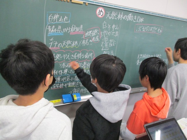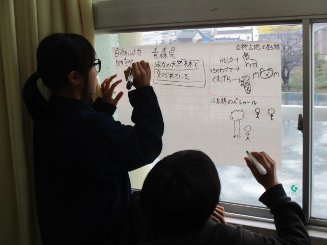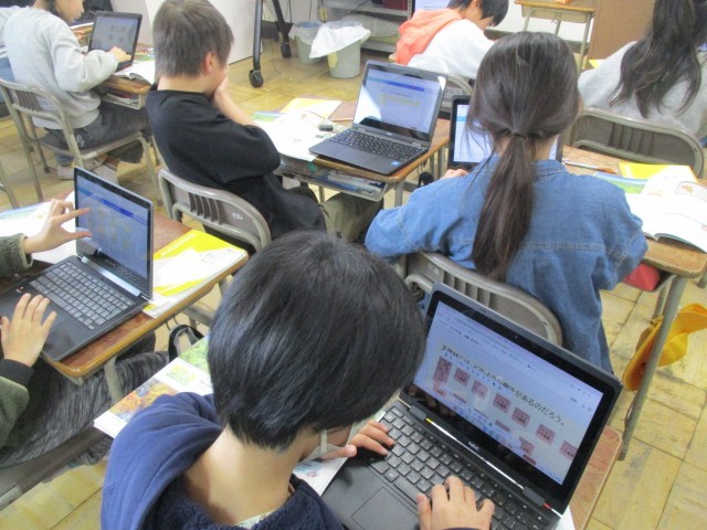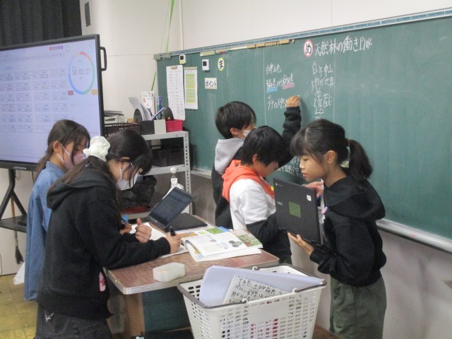 わたしたちの生活と森林について学んでいます。教科書から天然林の働きをchromebookを使って分析し、まとめたことをみんなで話し合い、学び合っています。