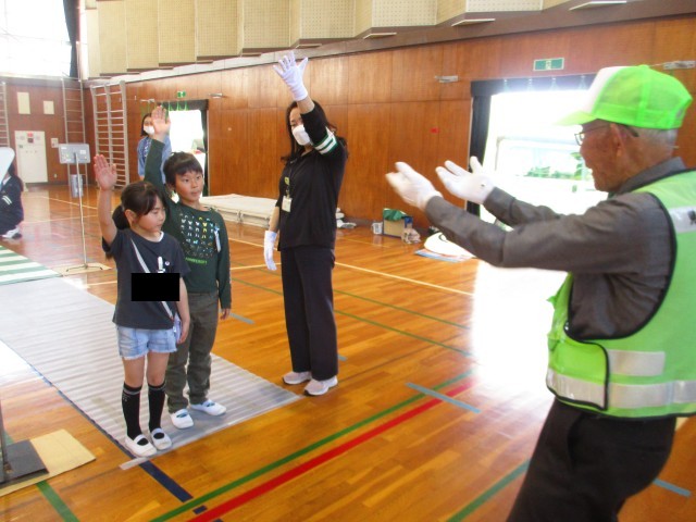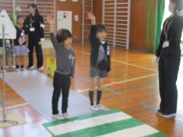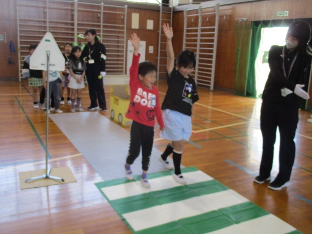 交通安全教室の様子です。横断歩道を歩くときは右左右を見て、信号を確認してから渡ることを教えてもらいました。実際にわたる練習をしました。