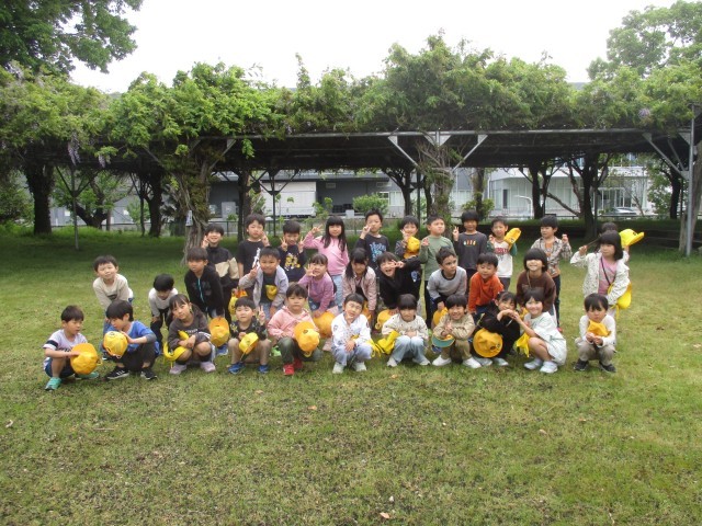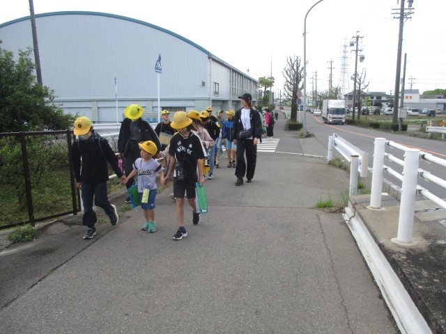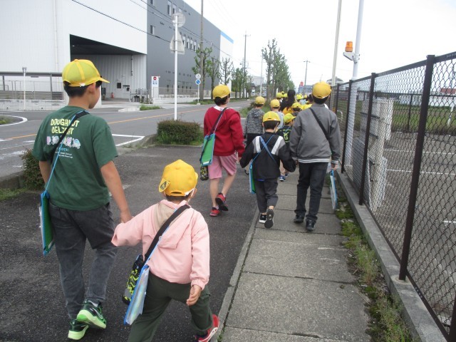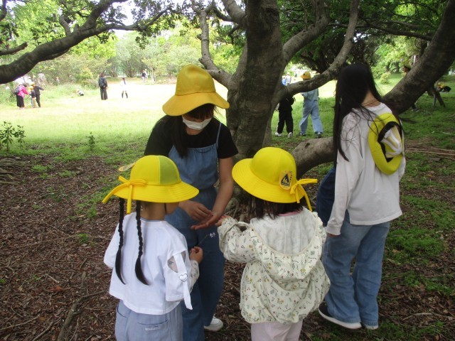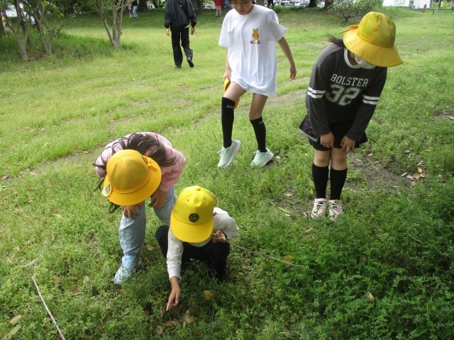 雨も上がり、よい気候の中で6年生のペアと一緒に校外学習へ出掛けました。会話も弾み楽しく歩きました。着いたら探検です。若葉が茂る広場をみんなで歩きました。