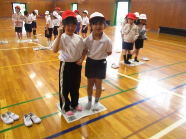 4月23日(木) 体育 (2年生) 公開日 2026/04/23 更新日 2026/04/23 2年生 体育の様子です。立ち幅跳びの練習を行いました。また、新聞を使ったゲームも楽しんで取り組むことができました。